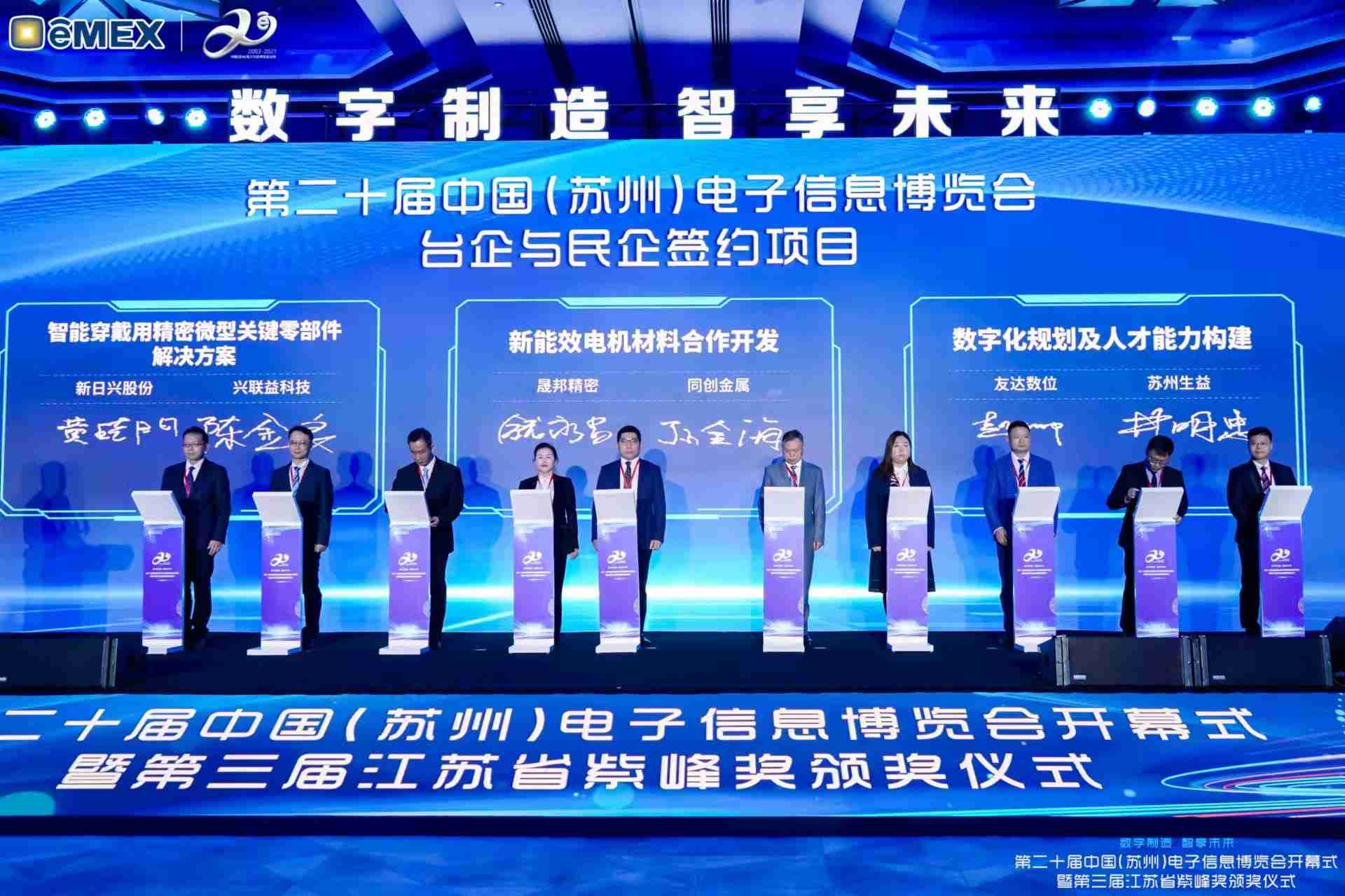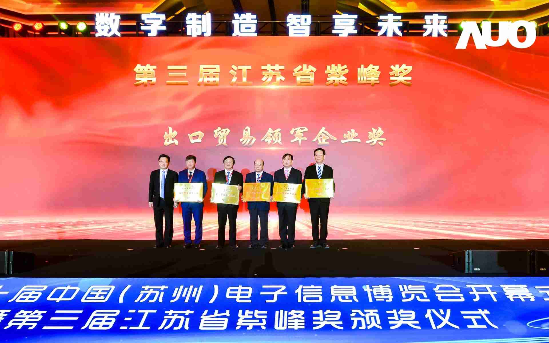 电博会开幕式当天也是第三届江苏省紫峰奖颁奖仪式,,,省台办、、工信厅、、、商务厅、、、、苏州市相关领导均出席并颁奖。。。。该奖项为表彰对江苏高质量发展做出积极贡献的在苏企业,,,,由江苏省政府专门设立。。2468BET光电 (苏州) 总经理郭振明代表上台领奖,,这也是2468BET苏州连续三次蝉联紫峰奖 出口贸易领军企业奖。。2468BET数位总经理赵丽娜女士,,,,也参与本次开幕式,,,,上台为本地化赋能签署战略合作协议,,,将优质服务资源集合、、、、下沉到更多细分行业,,,,为更多地区的制造企业提供数字化转型服务。。