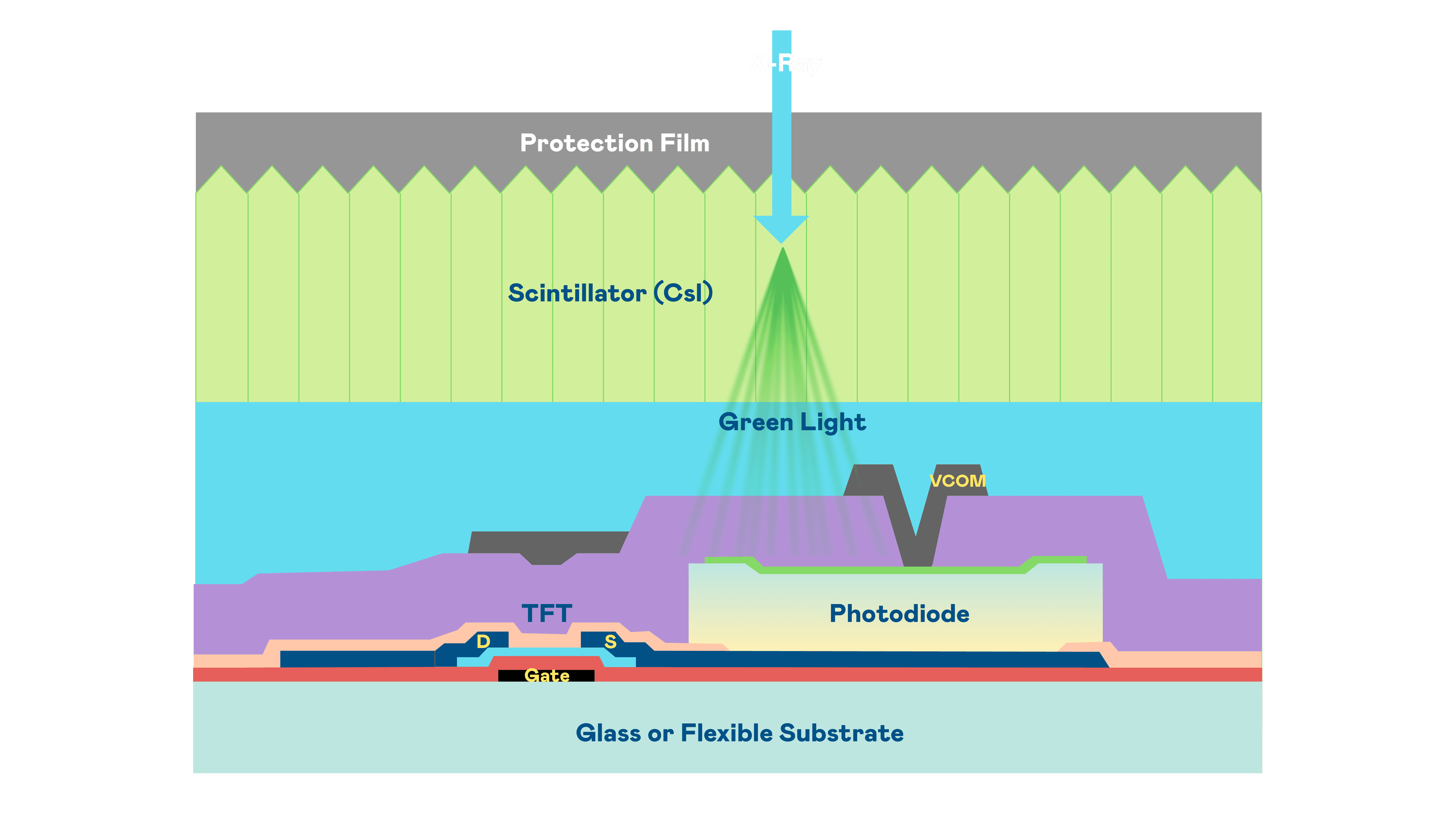 2468BET的X光影像感测阵列使用薄膜电晶体 (TFT) 作为每个像素的读取开关,,,,搭配光电二极体(Photodiode)的光电转换元件,,,,用以感测X光影像讯号。。。
